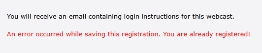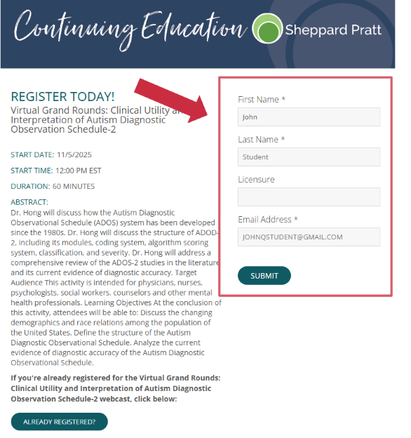 If you register right before the live broadcast begins: Click on the registration link located on the Overview tab. Enter your first name, last name, and email address. Click Submit.